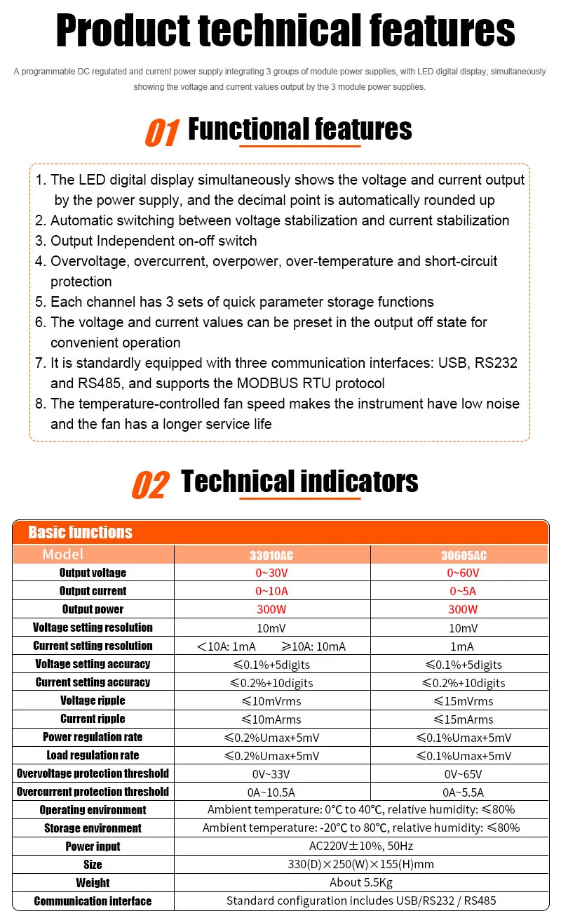 Two model options – 33010AG (0-30V, 0-10A, 300W) and 30605AC (0-60V, 0-5A, 300W) to suit different voltage/current requirements